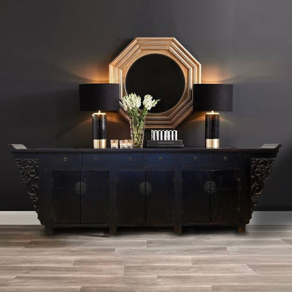 Looking for an exceptional large sideboard to make a statement, this magnificent early 19 century sideboard will do the job. The top of this Asian sideboard has the everted ends, a subtle reminiscent of ancient Chinese architecture, multi-stone pagodas. The top is made of one continuous wood instead of 3 individual sections. Two sides are flanke...
