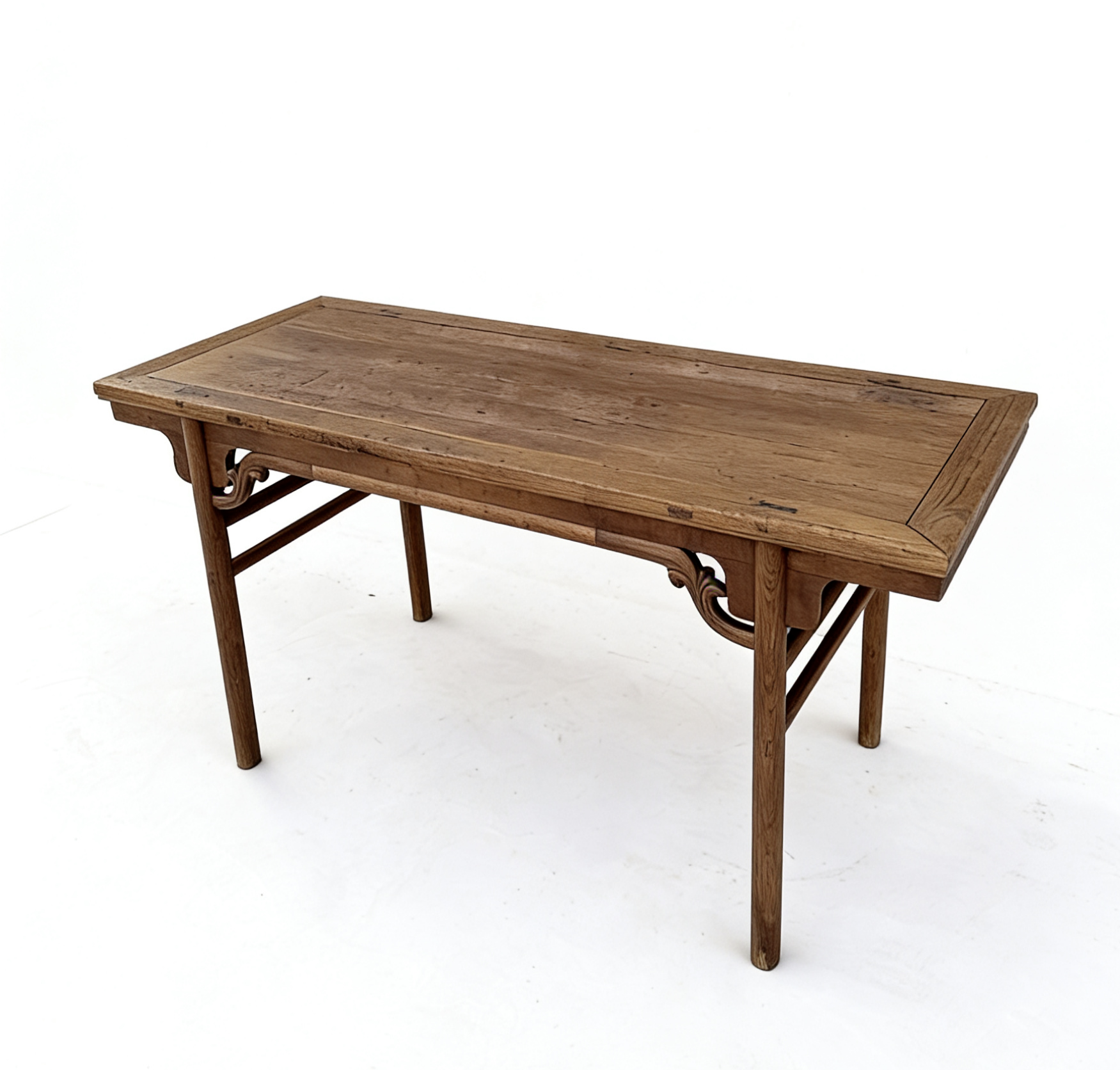 Retrieved from the Shanxi province of China, this altar-style elm console table features a rectangular panel top with subtle everted flanges. Retaining its natural warm grain, the honey-colored finish highlights the traditional mortise and tenon joinery used throughout. This console table adds grace and class to a hallway, entranceway, living or...