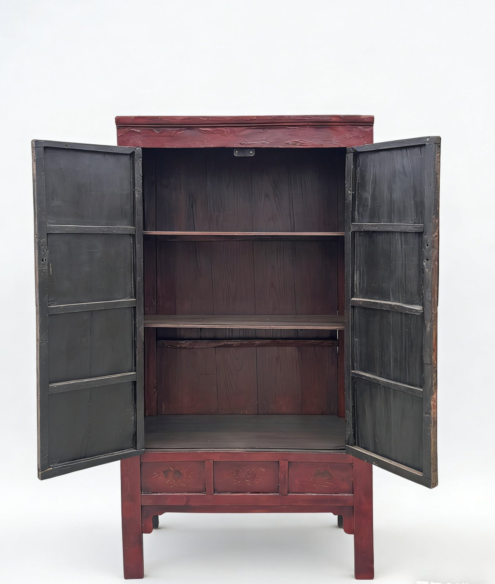 This 19th century armoire cabinet was handmade from sturdy catalpa wood and features a red finish with a traditional square cornered design. The interior has 2 shelf rows and two hidden inner drawers for versatile and secure storage. Built using classical tenon and mortise joinery, the piece maintains its natural wood knots and imperfections, sh...
