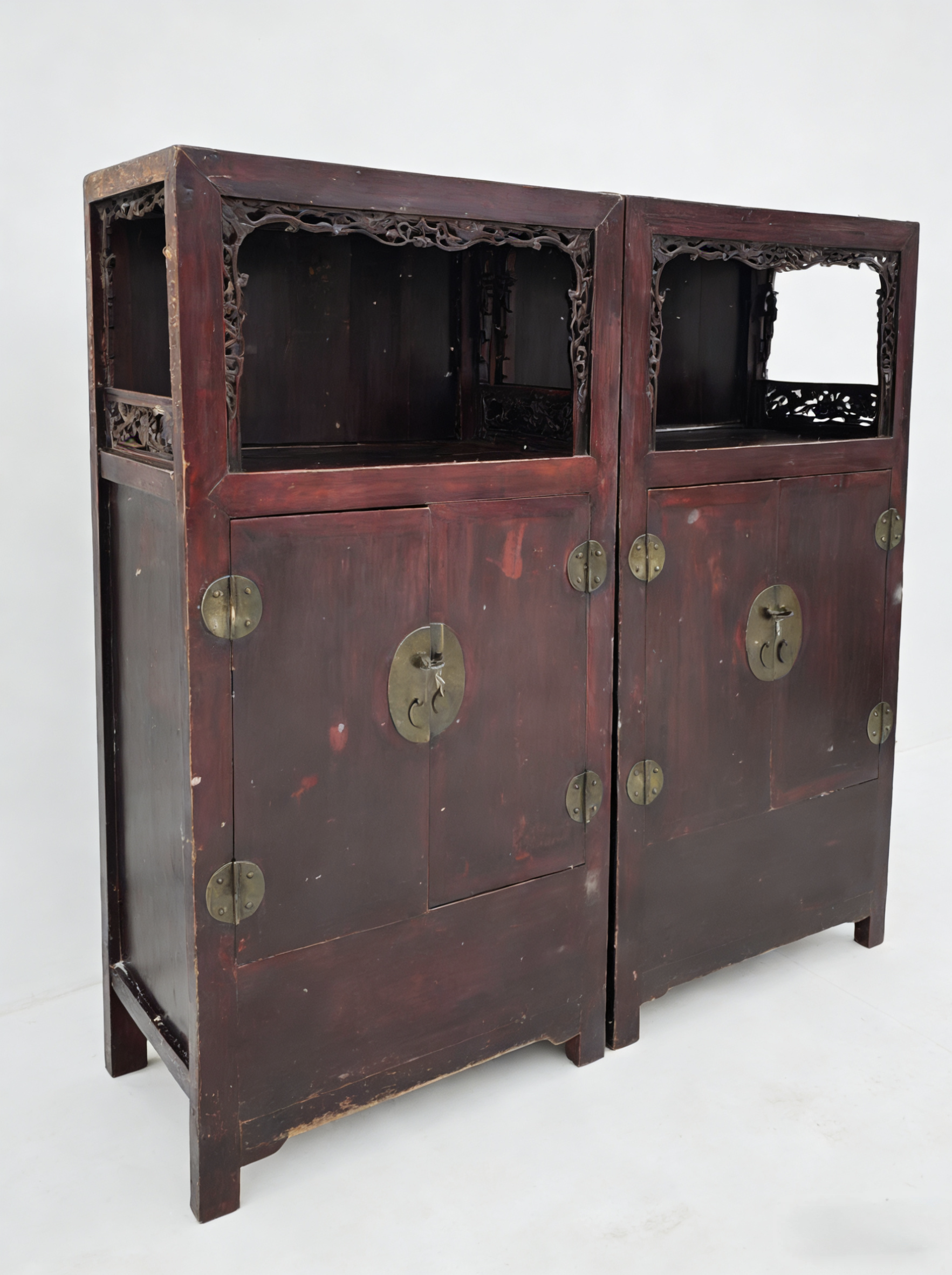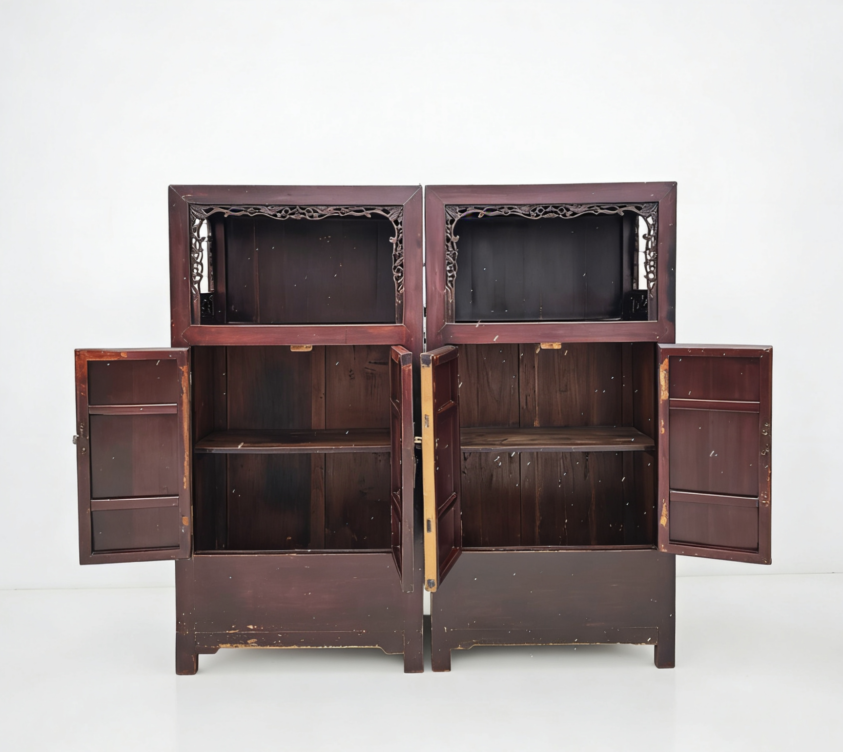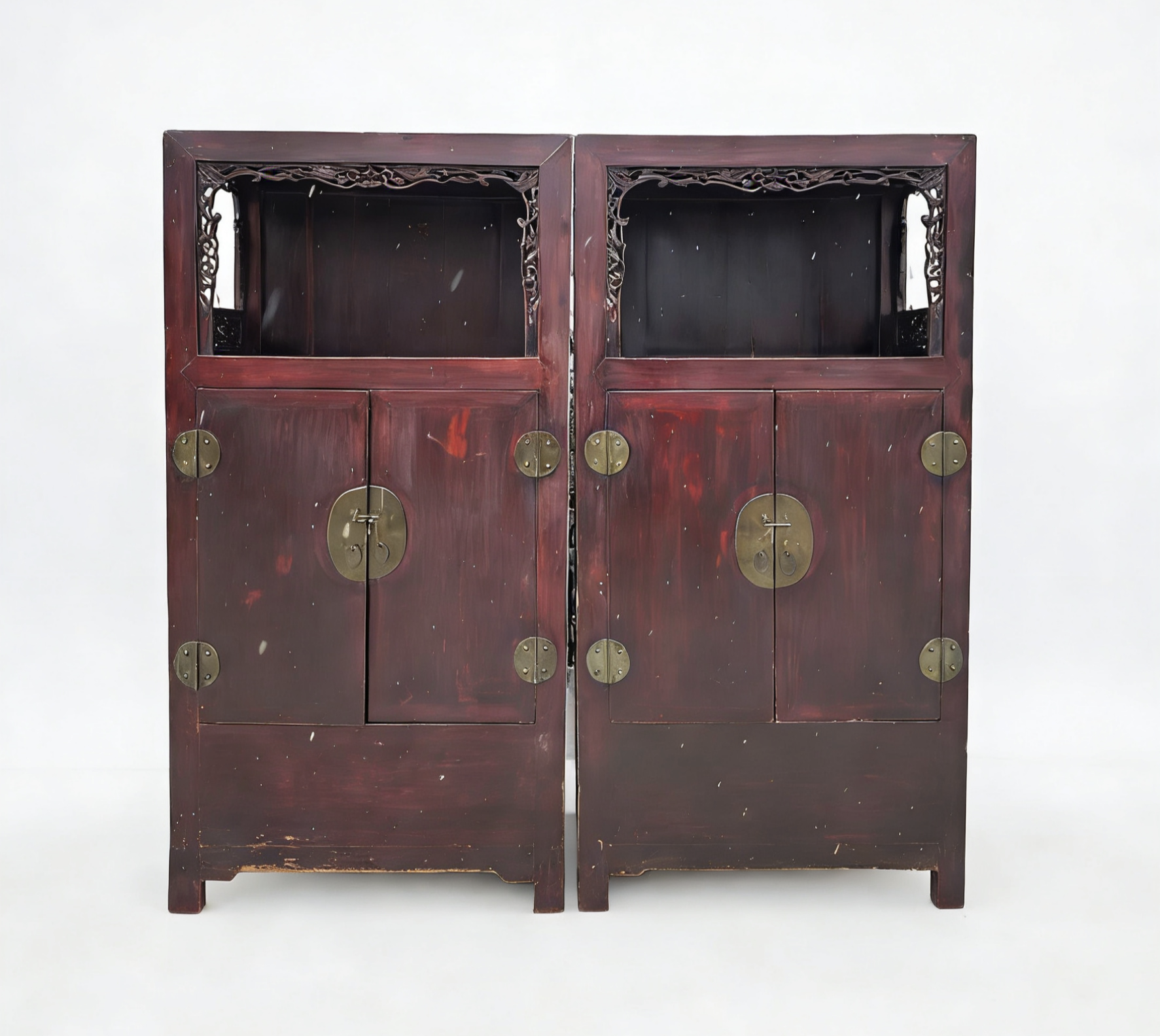 Traditionally this classic Chinese storage cabinet was always used as a pair and placed symmetrically in a living room to keep balance. One smaller cabinet on top. The larger cabinet has 2 shelves with one removable and adjustable shelf. The structure and surface restoration was very minimal. This beautiful antique Chinese cabinet will be excell...