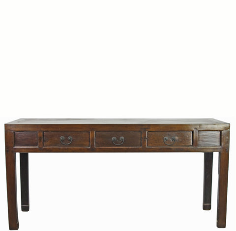 This dark brown antique Chinese desk has 3 drawers, gorgeous hand carved board , and a beautiful cracked ice foot rest. This antique Chinese writing desk adds a touch of Asian elegance to an office or any living space. Item No.: DSK231 Dimension: 50"W, 18.9"D, 33.9"H Circa: 1873 Material: ...